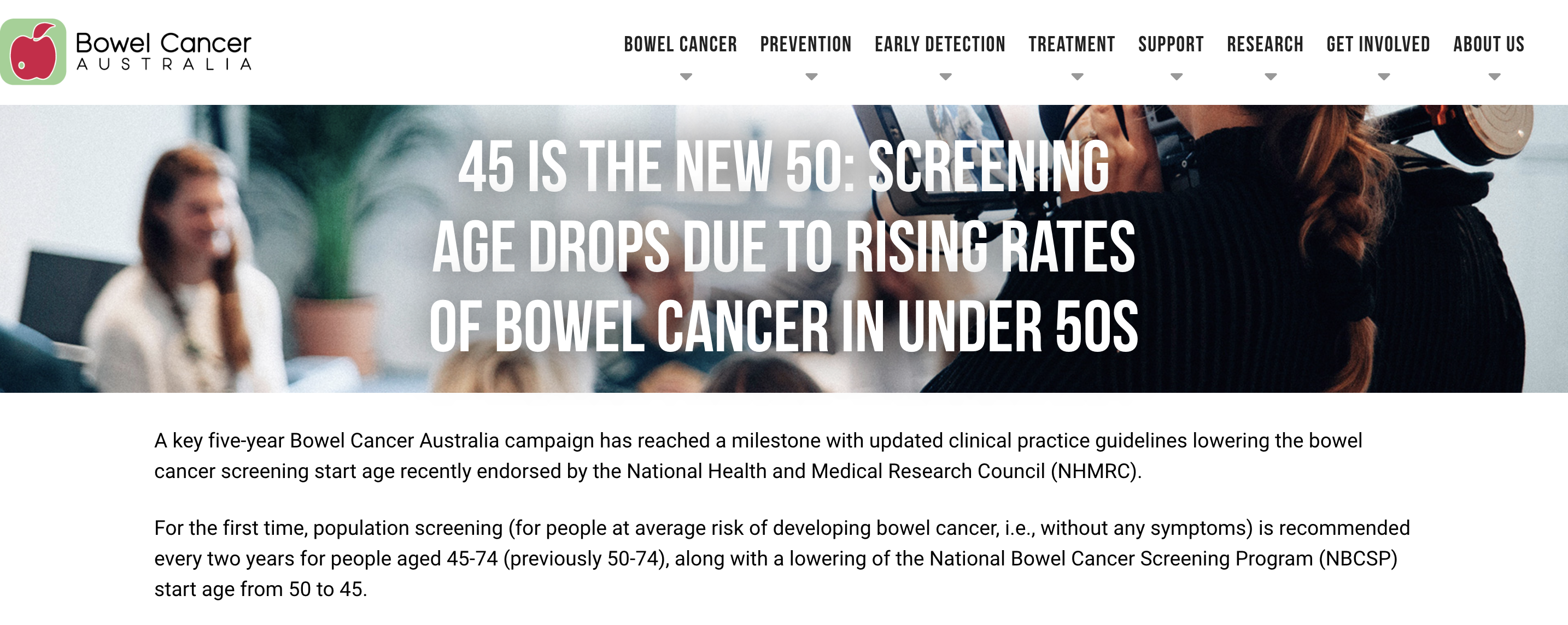 *See ‘Never2Young’ initiative by Bowel Cancer Australia.