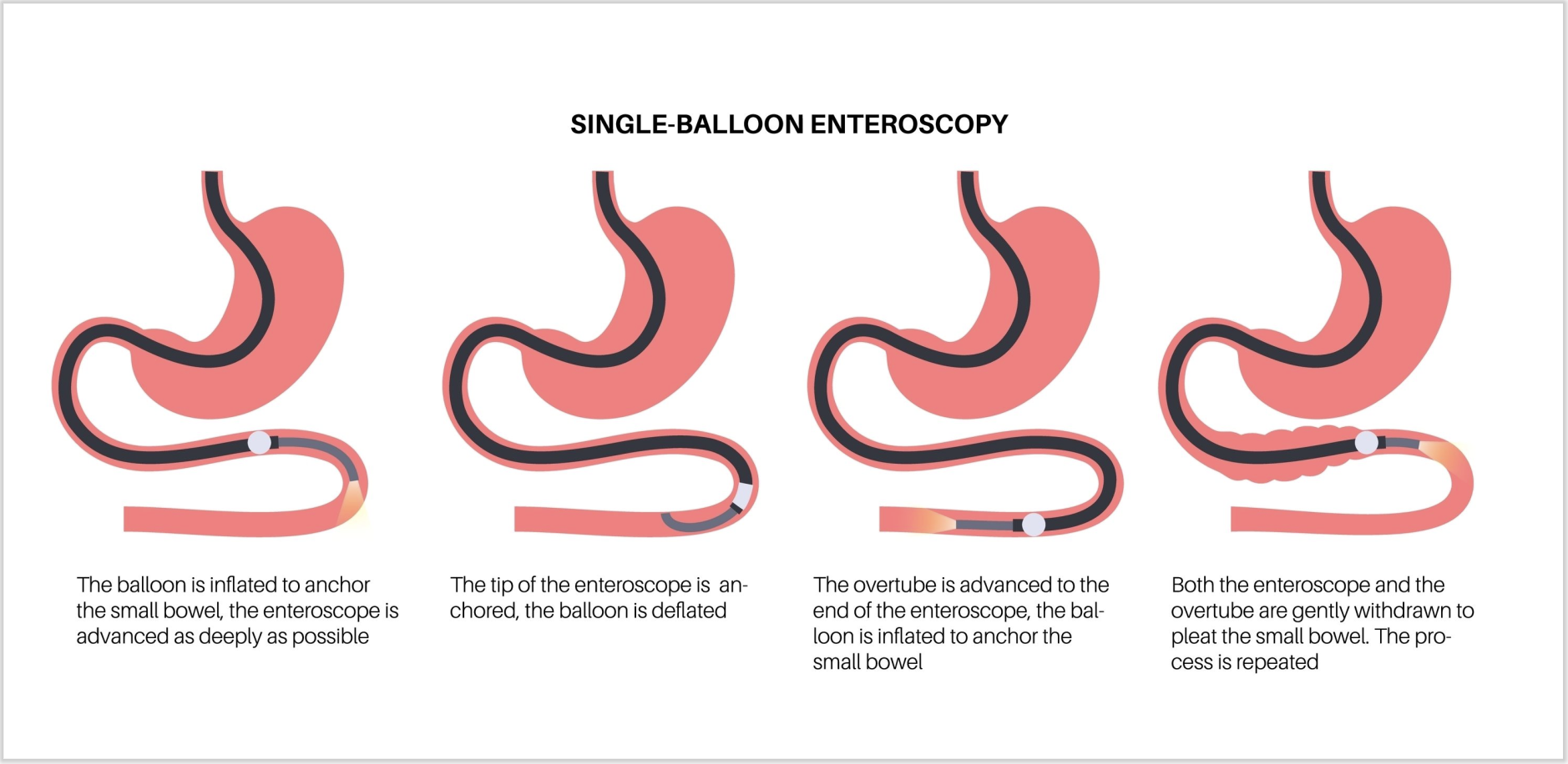 During the procedure, a thin, flexible tube with an attached camera, called an endoscope, is inserted into your body. A long, thin enteroscope (type of endoscope) is placed inside a tube, which has an external balloon which your endoscopist controls to guide the device through the small bowel. This allows the device to move forward, a little like a caterpillar bunching and reaching.